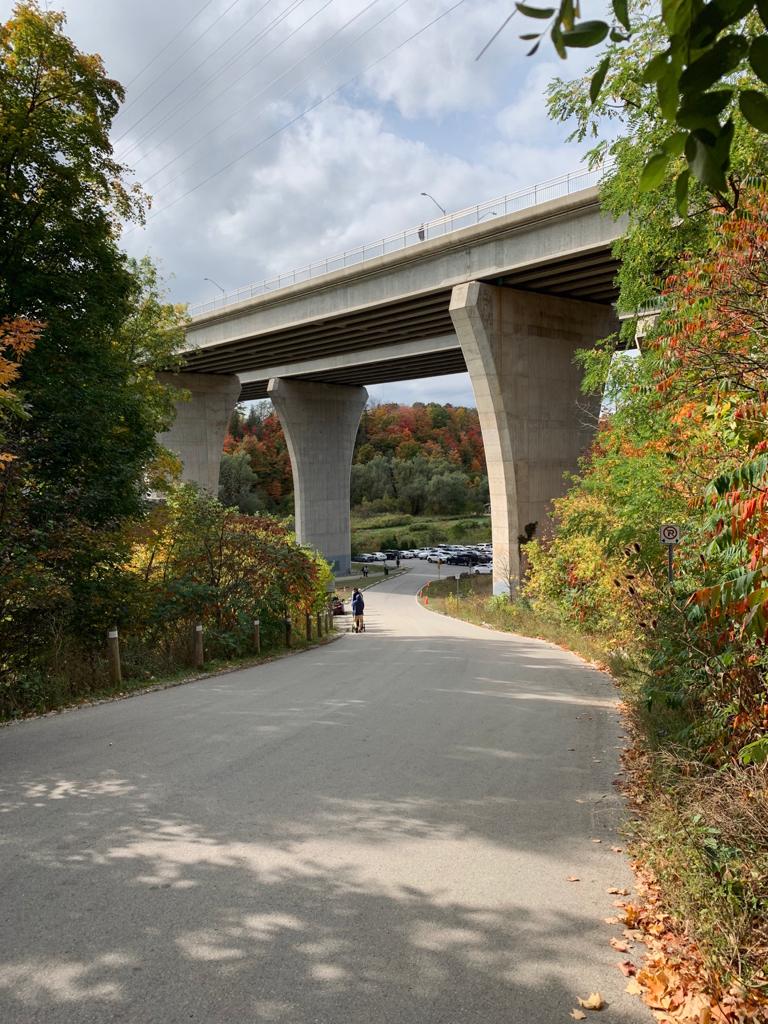 I chose to start my photo journey from the main parking zone at Lions Valley Park. The downhill slope leading to the parking lot is beautiful and gives photographers a chance to capture a vast picture of the road, the bridge, the fall colours and the park all at once.