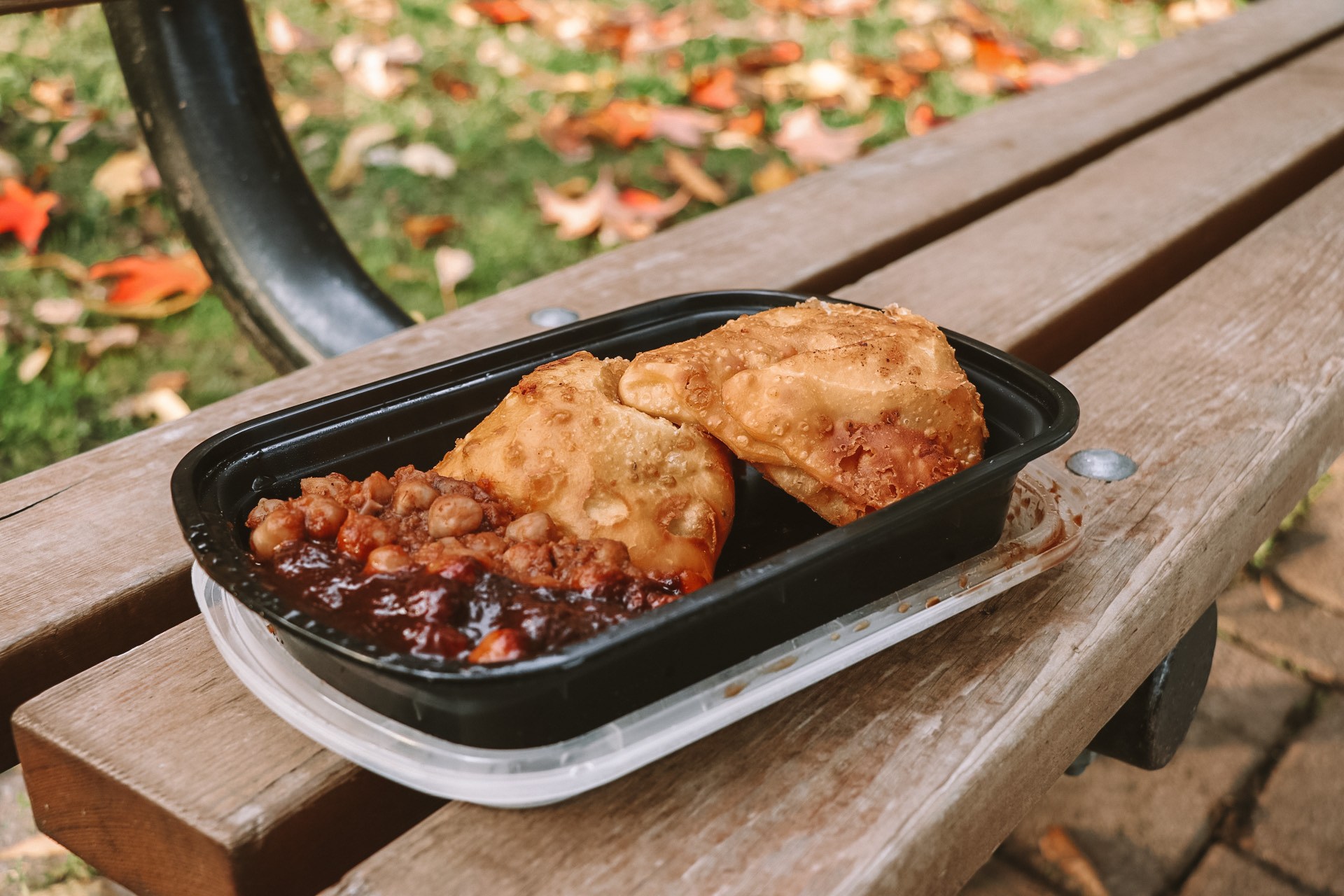 An order comes with two samosas and a generous helping of a stewed chickpea dish! This snack is almost meal-sized for me, so I opted to have one for now and one for later. Grab a snack or meal to go from this local spot and take the short walk over to Lakeside Park for some serene dining with views of the autumn leaves blending into Lake Ontario!